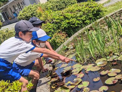 本日(5/9)の昼休みの様子です!やっぱりいました!ビオトープ『ぞうの池』をのぞき込む子どもたち!そっと会話に耳を澄ますと、「おたまじゃくし大きい!」「何で同じところにいっぱい集まるんだろう?」「アメンボ見て!」「あれは何?」「魚は見えないね。」…聞こえてきます、子どもたちの声!会話が弾んでいます!『ぞうの池』をのぞきこむ子どもたちの表情があまりに素敵なので、写真を撮りました!こんなに注目されて、池の中の生き物もうれしいことでしょう!