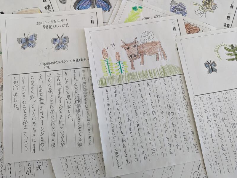 先週の金曜日(5/12)に4年生が行った草原学習の振り返りを、本日(5/15)行いました。実は…子どもたち、草原学習には出かけたけれど、目的の高森町に生息する絶滅危惧種『オオルリシジミ』に会うことができなかったのです。決して運が悪かったのではなく、なかなか見られなくなっていることを知った子どもたちは、その原因を知りたい、そして、自分にできることを考えたいと、休み中の自主学習ノートに自分の思いを綴りました。そして、その思いを本日一枚のシートにまとめました。