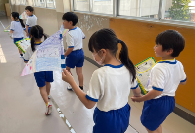 写真は、5/17(水)3校時の様子です!学校生活に慣れてきた1年生に、くわしく各教室のことを説明するのは2年生です!生活科の時間にたくさん準備して、この日を迎えたのです!手に持つ旗も手作り!張り切っています。
