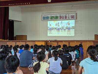 校長先生から、運動会でのがんばりをたくさんほめてもらった子どもたちは、誇らしげな表情を見せました。その後は、運動会の練習から本番までを記録した動画を全校児童で視聴しました。運動会までの3週間が思い出され、改めてこの運動会を全校児童と職員で作り上げた喜びや達成感を感じました。担当の職員からは、『熱』をテーマに、「赤団の団長は、6年生になる前から団長になりたいという『熱』を持ち、白団の団長は、練習期間に最後の一人まで見送り使った教室の鍵を閉め、みんなを見守る『熱』を持っていた。そして、先生も、みんなに『熱』が伝わるように取り組んできた。みんなの前で校歌を歌ったことも、その一つ。(こうしたい!)という『熱』をもってみんなが取り組んだことでたくさんのものを得て、レベルアップできたんだよ。」と、熱意のこもったメッセージを伝えました!