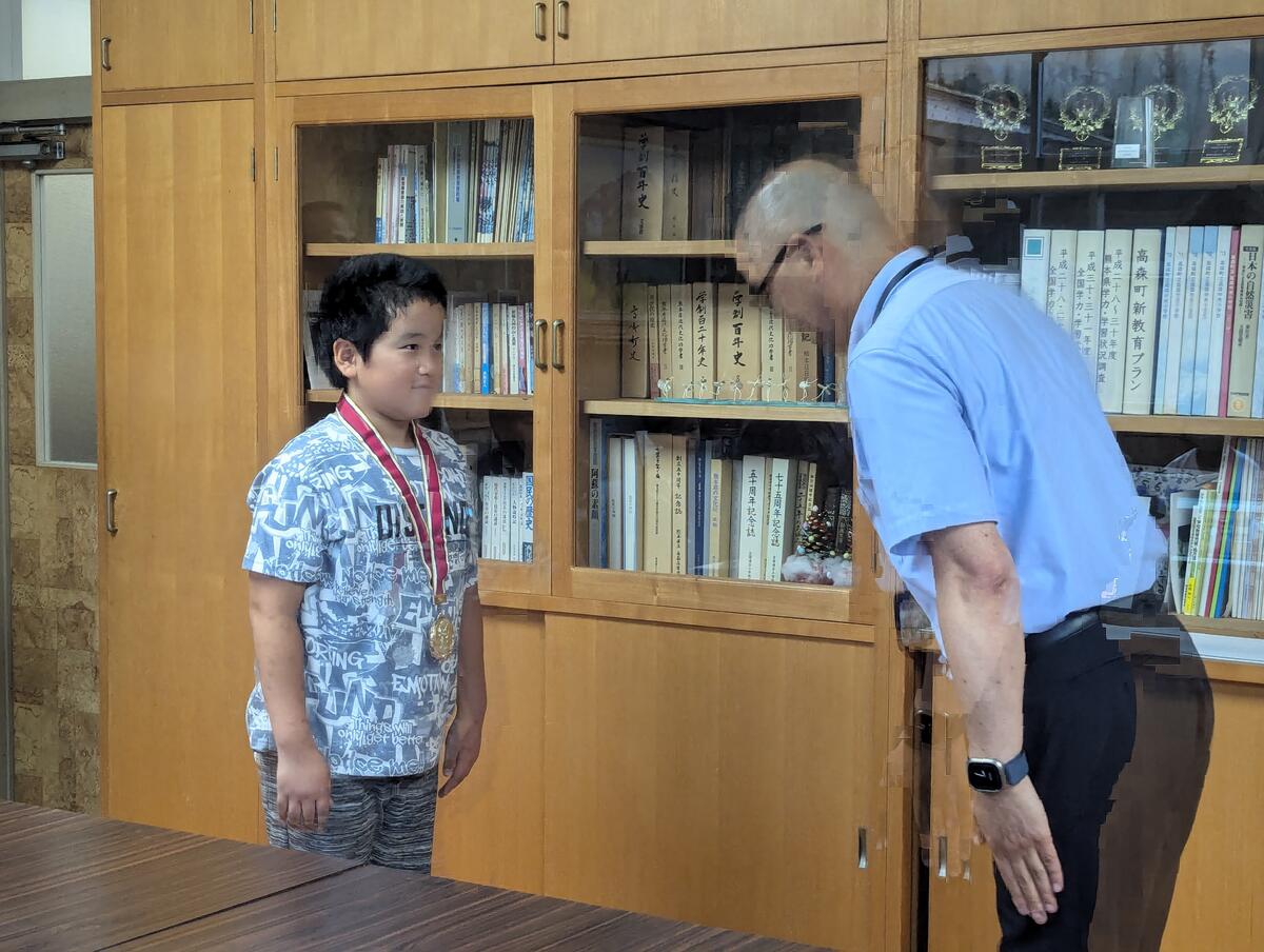 写真は、本日(7/2)朝活動の様子です。過日(6/22)に益城町総合体育館を会場に行われた、自転車大会に参加した子どもたちの表彰を行いました!校長室に招かれた子どもたちは、大会と同じくらい緊張した表情で、立派なメダルを受け取りました! これから、高森中央小学校の交通安全のリーダーとして活躍してくれるに違いありません!