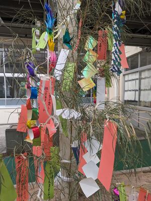 写真は、低学年棟の入り口、ひまわり1組教室の前で見つけた七夕飾りです。子どもたちが、楽しそうに話しながら、一つ一つの飾りを手作りする様子が浮かびます。どんな願い事を書いたのでしょう。