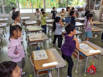 さて、教室の奥に見える長くてカラフルな飾り!そう、本日の午前中に、子どもたちが図工の時間にはさみでチョキチョキ作った飾りです!心地よい阿蘇の初夏の風にゆられて、何とも可愛らしいこと!連休中、子どもたちのいなかったさみしい教室が、一気に彩られました!ああ、やっぱり、子どもたちのいる学校は、いいものです!
