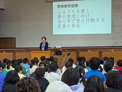 また、先日の南阿蘇鉄道全線開通を話題にして、高森町が全国から注目されていること。高森中央小学校の子どもたちは、一人一人が高森町の宝であること。高森町の一人として、元気のよいあいさつで多くの人々を迎えてほしいこと。そして、この夏休みを、ふるさと高森町のいいところを探す時間にしてほしいことを話されました。