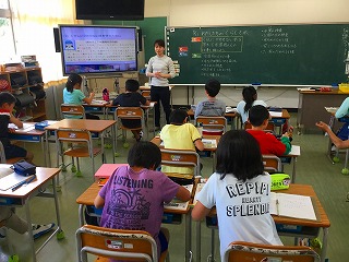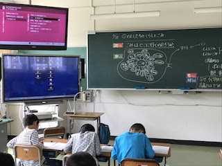2年生に引き続き伺った4年生の教室です。今年来られた桐原先生が電子黒板を活用して、社会科の授業をされていました。4年生は地域学習が中心で、本校でも副読本を活用しています。しかし、この副読本にはデジタル教科書がありません。そこで、実物投影機を活用し、画面保存でパシャ!そこにアンダーラインを引いたりしながら理解を図ります。工夫次第で活用は無限に広がります。