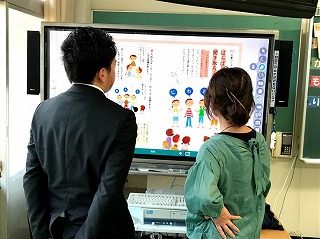 今年で三年連続新規採用教職員は配置された本校。若手の先生がどんどん増えています。今年も大学を卒業したばかりの先生が赴任されました。本校の実践しているICT環境をいかした実践に戸惑われていましたが・・・ある日の放課後、本校のベテランの先生が電子黒板を前に使い方を伝授!これこそが本校の「力」だと思います。OJTでつながっていく教職員集団です。