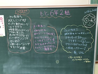 11日の夕方、中学校の入学式を終えた本校の卒業生が入学の報告にやって来ました。真新しい制服に身を包み、笑顔一杯の報告に小学校としても嬉しく思いました。元担任が不在であることを知った子供達は・・・こっそりと教室へ。たくさんの「落書き」(笑)を残していってくれました。どのメッセージも心温まるものばかり。まだまだ寒さ厳しいこの高森ですが、心がとても温かくなりました。入学おめでとうございます!