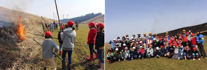 2月5日、金曜日。待ちに待った野焼き体験学習を行いました。もともとは1月29日の予定でしたが、雨が降って火の付きが悪いということで延期になっていたところです。待った甲斐があり、当日は素晴らしい晴天に恵まれることができました。阿蘇青少年交流の家主催で、高森中央小学校と坂梨小学校合同での活動となりました。みんなでバスに乗り草原に向かいます。現場には牧野組合長の市原さんやコーディネーターの木部さんをはじめたくさんのボランティアスタッフに出迎えていただきました。わらを束ねてたいまつをつくり、8班に分かれて作業開始。最初は戸惑う姿も見られましたが、しっかりと友達と協力する姿も見られました。阿蘇の草原を守る野焼きを実際に体験することで、この作業が危険で大変なものであることや共同作業の大切さを体感することができたようです。自分たちの故郷阿蘇の素晴らしさをこれからも受け継いでくれることを願っています。