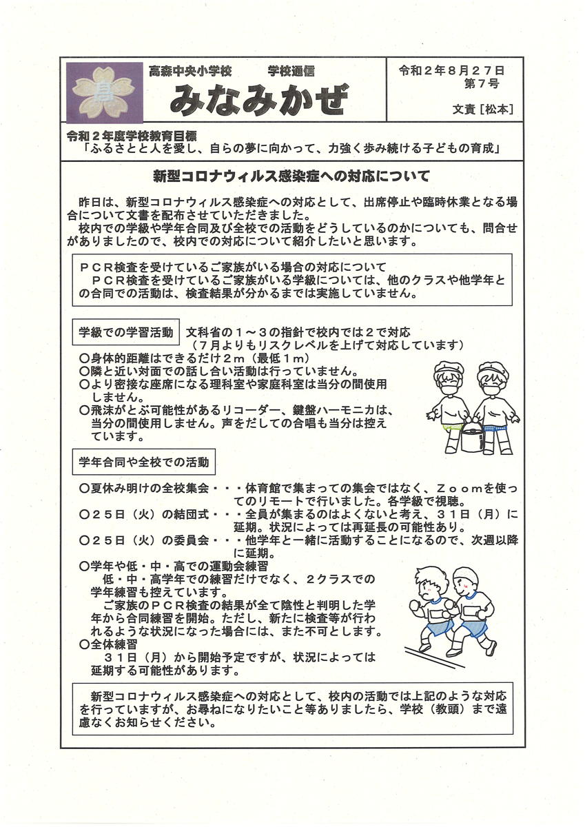 新型コロナウイルス感染症の拡大が気になるところですが、感染防止対策をしながら教育活動は行っています。気になることがありましたら、学校にご相談ください。