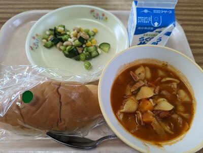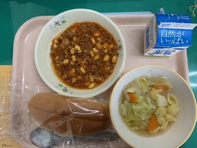 牛乳、コッペパン、チリコンカン、マカロニスープ