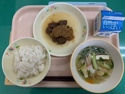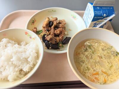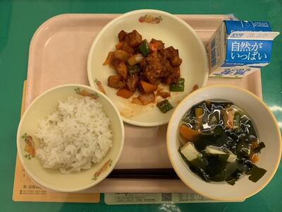 牛乳、麦ご飯、わかめスープ、酢豚(すぶた)