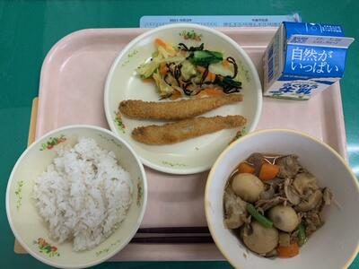 牛乳、麦ご飯、小松菜の塩昆布あえ、ししゃもフライ、さといものうま煮