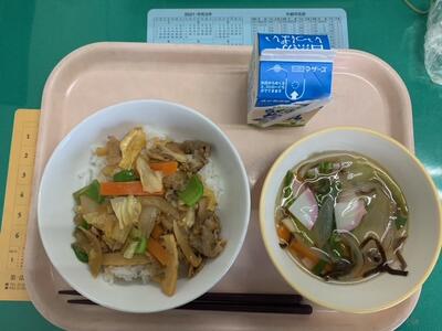 牛乳、回鍋肉丼(ホイコーローどん)、中華スープ