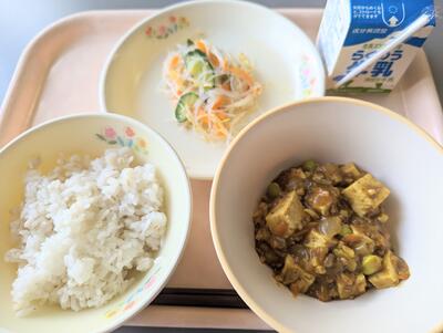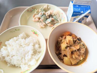 小学生は、今日が初めての給食ですね。今日は、人気のカレーライスの登場です。海藻サラダは、鉄分・マグネシウム・カルシウム・食物繊維といった栄養がたくさん入っています。