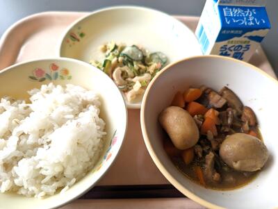 今日のししゃもフライには、骨や歯をつよくするカルシウムやEPA、DHAという体にとって、とてもよい栄養がふくまれています。フライにすることで食べやすくなっています。さといものうま煮はにんじん、いんげん、さといも、しいたけ、豚肉とたくさんの品目が入り、いろどりよくおいしくいただきました。
