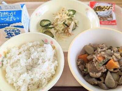 牛乳、麦ご飯、れんこんのはさみあげ、いとかまぼこと切り干し大根の和え物、こんさい汁