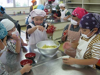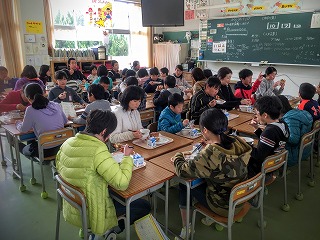 1・2年生で一生懸命掘ったサツマイモを使って、スイートポテト作りを行いました。6名の食育改善委員会の方々にご協力いただき、子どもたちは料理を楽しみました。子どもたちはイモを潰して、材料を混ぜて、形を整えることを体験しました。できあがりはイモ本来の甘みが強くとてもおいしく仕上がり、給食の時間に食べました。思わず子どもたちも満面の笑みを浮かべていました。食育改善委員会の方のこだわりで、イモを茹でず、ふかすことで甘みが強く感じられたということでした。自分たちの手で野菜を育てること、自分たちで料理したものを食べることの喜びを学んだ貴重な経験となりました。