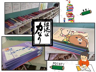 この1年間続けてきた自学ノートです。1冊終わるごとに、ずっと集めてきたら、こんなになりました。すごい!のひと言ですね。毎日欠かさず取り組んできた子どももたくさんいましたし、内容や取り組み方を工夫していた子どももいました。自学ポイントカードと共に取り組んできたことで、がんばりが残る形で取り組んできました。自主的にしかも楽しみながら学習をする習慣が身につけば、中学校でもしっかり力を伸ばしていけると思います。「継続は力なり」。