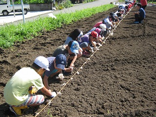 朝からムンムンと暑いなか、ロープのしるしに沿って植えていきました。今回植えたみさを大豆が枝豆に変身し、味噌に変身し、来年の3年生が植える種に変身する・・・。わくわくです。