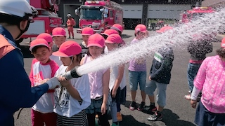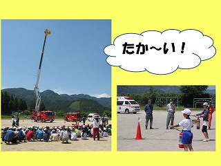 業間と3校時に火災避難訓練がありました。阿蘇南部分署の消防士の方に来ていただきました。避難の後は、水消火器を使った消火体験活動と、はしご車の見学&乗車を行いました。25メートルまで伸びるはしご車に6年生の代表児童が実際に乗車しました。「たのしかった!!」そうです。 晴天の下、たくさんの活動を行うことができました。