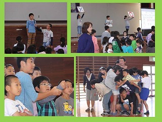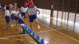 2年生の体育では、多様な動きをつくる運動遊び(いろいろな動き遊び)という単元を学習しています。この単元は、用具やボールを使ったいろいろな運動遊びの中から、動きを習得することをねらって位置づけられています。子どもたちは、ボールやフラフープ、平均台を使っていろいろな動きにチャレンジしました。回数を重ねるごとに上手になり、多様な動きを身に付けてきています。そして、何よりも楽しそうに運動する子どもの姿が印象的です。