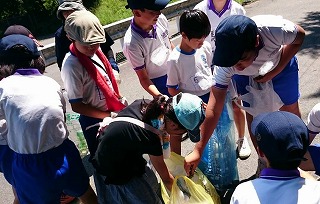 とてもいい天気の下、2・3校時に「町をきれいにしよう大作戦」がありました。高森中学校と合同の清掃活動行事です。小学生は縦割り班ごとに活動しました。中学生のお兄さんお姉さんと一緒ということで、少し緊張しながらも楽しそうに活動していました。これは別所池付近の写真です。花火やたばこのゴミが多く落ちていました。拾ったゴミは学校でしっかり分別しました。高森町の美しい景色をいつまでも残していきたいですね。