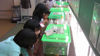 2年生では、生活科の学習で生き物を育てています。現在、保護者の方からの協力もあり、「めだか」「おたまじゃくし」「あおむし」「かたつむり」「バッタ」の5つの生き物を育てています。えさをあげたり、すみかを作ったりしながら、毎日観察しています。小さな生き物ですが、毎日見ていると愛着も沸いてきます。もうしばらくの間、みんなで大切に育てたいと思います。