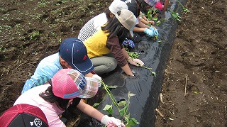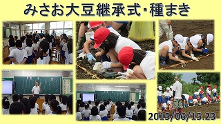 6月15日に昨年度4年生が育てたみさお大豆の継承式があり、次の3年生に渡されました。継承式では、大豆がどんな食品に変わるのかを丸美屋納豆の福永さんが詳しく話をしてくださいました。また、23日に種まきを行いました。種をまいた後は、4Hクラブの方が、ほとんどお世話をしてくださいます。大豆を収穫した後は、みんなで豆腐や味噌も作ります。
