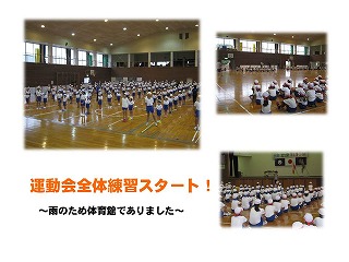 運動会全体練習が始まりました。特別日課となり、8時35分から1時間の練習があります。今日は雨だったため体育館で、開会式と全校ダンスの練習がありました。運動会への心構えを持ったあと、気をつけや礼の仕方を確認しました。1年生も凛々しい表情でいました。これから本格的に練習が始まります。早寝・早起き・朝ごはん!体調管理をしっかり行い、練習から本気でがんばっていきます。