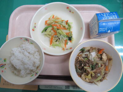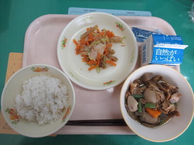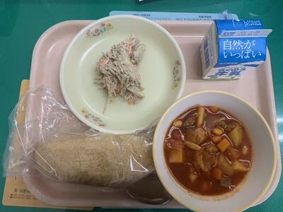 ポークビーンズは、白いんげんまめとぶた肉をトマト味でにこむアメリカの代表的な家庭料理のひとつです。給食では、白いんげんまめの代わりに大豆を使用しています。ぶた肉や大豆は体をつくるもとになります。子どもたちは、きなこたっぷりのあげパンを喜んで食べていました。