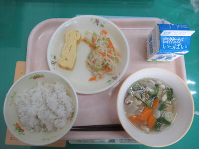 牛乳、麦ごはん、手づくりだご汁、切り干し大根のごまだれ和え、あつやきたまご