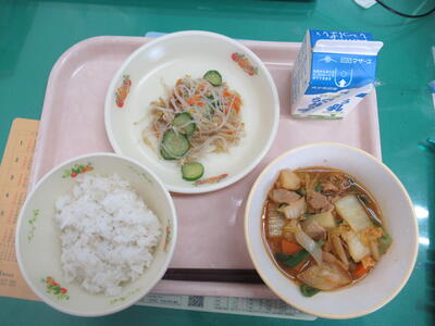 今日は味の旅「韓国(かんこく)」のこんだてです。とうふチゲはかんこく語で「スンドゥブチゲ」といわれ、スンドゥブがとうふで、チゲが鍋(なべ)という意味です。今日から16日までは持久走大会応援メニューだそうです。しっかり栄養をとって、体を元気にしましょう。