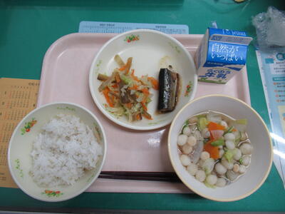 牛乳、麦ご飯、野菜のごまず和え、さんまのしょうがに、大根としらたまふのすまし汁