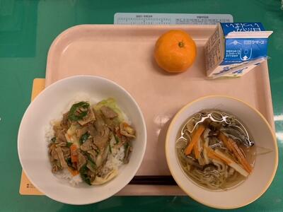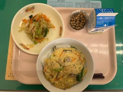 おやこどんは、とり肉、ねぎ、しいたけなどをにてたまごでとじ、どんぶりに盛ったご飯にかけたものをいい、とりにくとたまごを使うので「おやこ」という名前がついています。給食ではだしで野菜とお肉をにてあるのでしっかり味がついています。