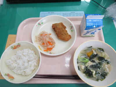 牛乳、麦ご飯、ゆず和え、あおさ入りホキフライ、カボチャのみそ汁