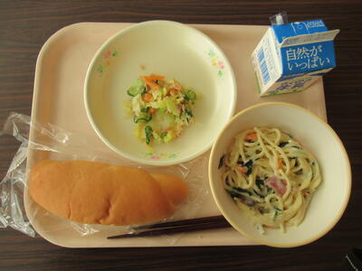 1月とは思えないほど温かく、よい天気に恵まれた1月10日、後期後半が始まりました。今日のメニューは、野菜たっぷりで濃厚なクリームスパゲティとパンとツナサラダの洋食メニューでした。おいしくいただきましたごちそうさまでした。