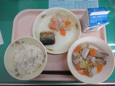 牛乳、麦ご飯、ぐぞうに、こうはくなます、さばのしょうがに