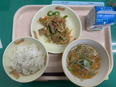 牛乳、麦ご飯、はるさめスープ、チンジャオロース