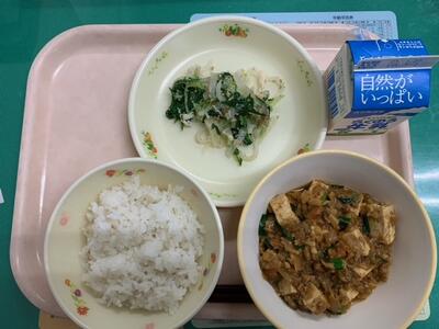 牛乳、麦ご飯、麻婆豆腐(マーボードウフ)、だいこんサラダ