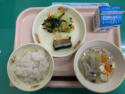 牛乳、麦ご飯、ぶたじる、さんまのうめに、ほうれんそうのこんぶあえ