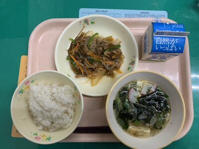 牛乳、麦ご飯、もずくいりチャプチェ、わかめスープ