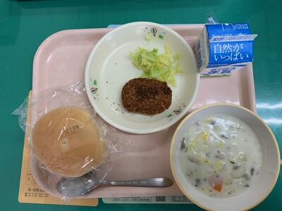牛乳、丸パン、白菜のクリームスープ、くじらのメンチカツ、ボイルキャベツ
