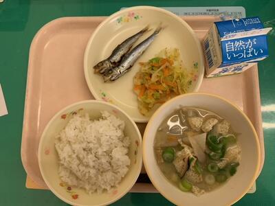 牛乳、麦ご飯、こんさいのみそ汁、めざし、たくあん和え