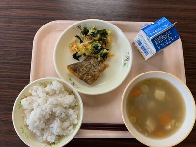 牛乳、麦ご飯、つぼんじる、さかなのかばやき、すみそあえ