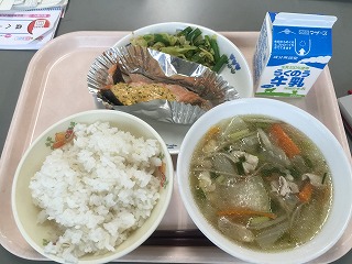 今日はホキのみそマヨホイルでした。魚に付いているみそダレが甘辛くて、ごはんがとっても進んだようでした。ホイルについたタレをおはしでこそいで食べている子もいました。今日はおにぎりづくりをした2年生と一緒に会食しました。隣で食べていた男の子が「ぼく、今日ののっぺ汁大好きなんです♪」と言いながらパクパク食べてくれ、とても嬉しい気持ちになりました。インフルエンザなどで休んでいる子がいたので、今日は野菜も多く、少し心配したのですが、食缶がキレイになって給食センターへ戻ってきて安心しました。モリモリ食べて寒い冬を元気に乗り切ってほしいと思います。