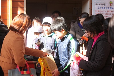 冬休み前日(12/24)の朝、大変寒い中に、北門前に10人ほどのお父さんたちが立たれ、あいさつ指導をされました。「おはようございます」の大きな声を子どもたちにかけてくださいました。声の大きさは、お父さんたちの勝ちでした。同時に交通指導もしていただき、「元気」と「安心」に満ちあふれた朝となりました。