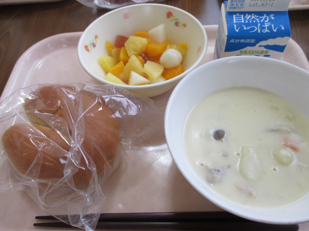 今日はきのこシチューの登場でした。最近、肌寒くなってきたので温かいシチューが体にしみたようでした!「昨日の晩ご飯もシチューだった!」っと言っている1年生の子どどもがいました(笑)