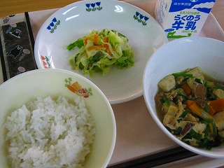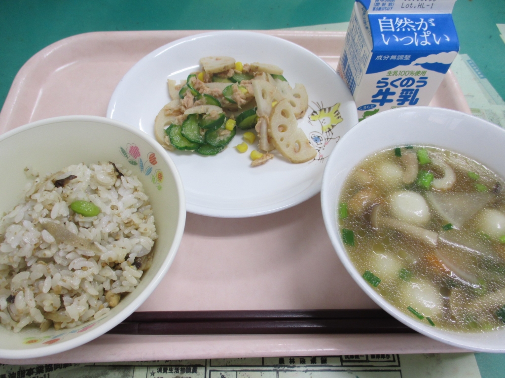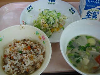 今日は、食物繊維たっぷり給食でした。切干大根にごぼう、大豆・・・など。食物繊維は体のなかのいらないものを外に出してくれる働きがあります。食物繊維の摂取が不足しているといわれる現代人、ご家庭でも積極的に取り入れるといいですね。