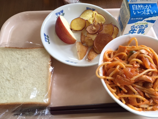 今日は子どもたちの好きなメニューだったようです♪パンにスパゲティーをはさんで食べている子もいれば、口の周りを真っ赤にしてバクバク食べている子もチラホラ…。