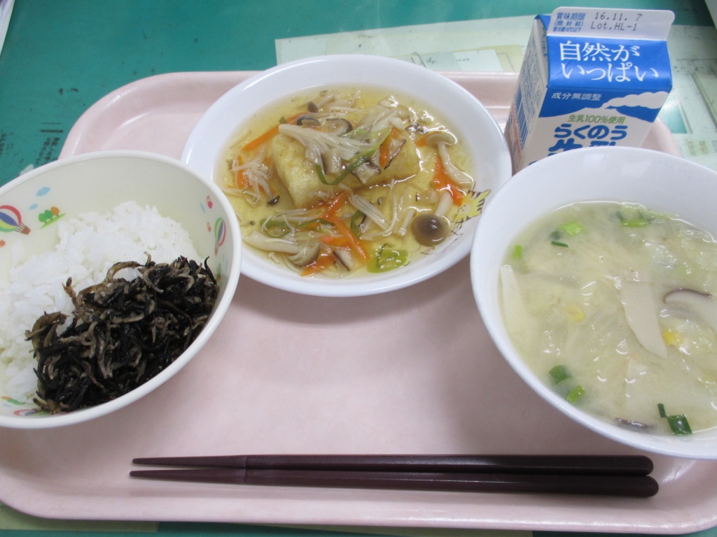今日は中学校が文化祭の代休でお休みだったので、小学校のみの給食でした。食数が少ない分、手の込んだ手作りメニュー「揚げ出し豆腐」にチャレンジしました♪きのこのおいしい季節なのできのこあんかけにしました。かつお節としめじ、しいたけ、えのきのいい味が出ていましたが、きのこが苦手な子どもたちにとってはみそ汁にもエリンギが入っていたので苦戦していました。